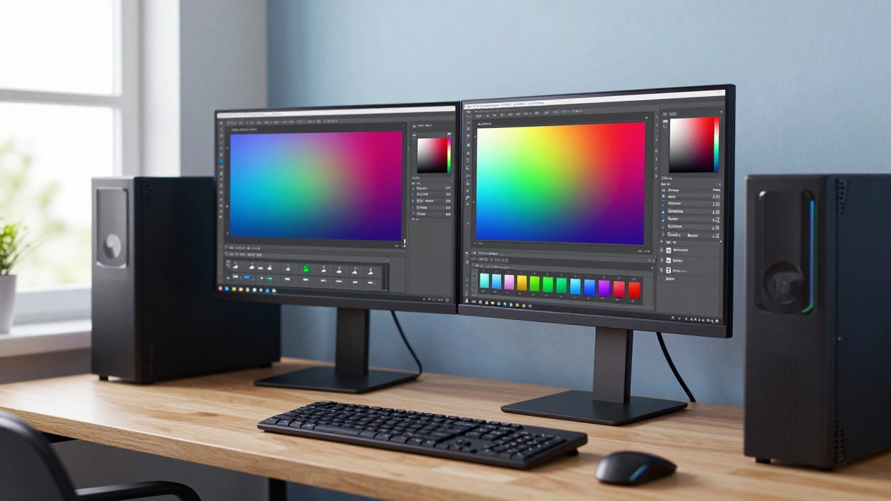 Даже лучший компьютер бесполезен с дешёвым дисплеем. Ключевой параметр - охват цветового пространства. Базовый стандарт sRGBохватывает 99% оттенков, видимых на большинстве устройств, поэтому берите монитор с покрытием 99% sRGB или выше. Диагональ от 24 дюймов обеспечивает удобство при работе над деталями.